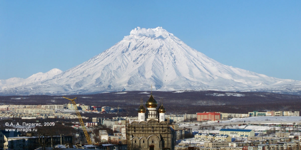 Вид на вулкан с 4-го километра в городе Петропавловске-Камчатском; на переднем плане — кафедральный собор Святой Живоначальной Троицы.